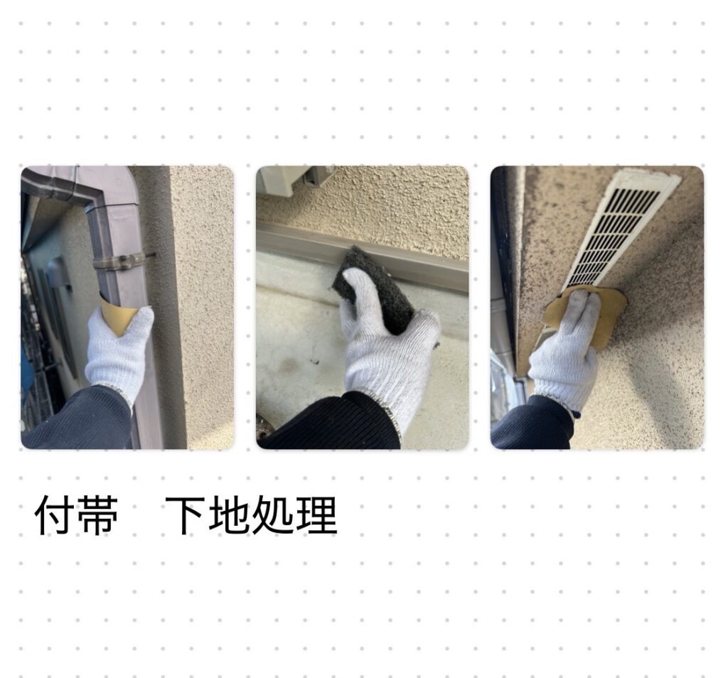 下地処理 樋・シャッターBOX・水切り・ベルコニー・換気フード 他 サンドペーパー等を使用し下地処理を行います。 |