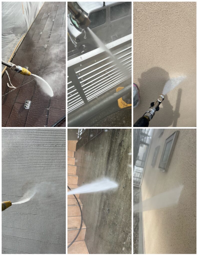 | 高圧洗浄 高圧洗浄にて汚れ苔等洗い落とします。 塗装箇所だけでなく、階段や擁壁等もきれいに洗浄致します。 |